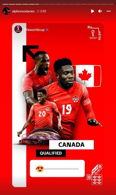 3月28日讯 加拿大在4-0战胜牙买加后成为第20支晋级卡塔尔世界杯的球队,在确定晋级后,阿方索-戴维斯在社交媒体上晒出了海报庆祝。
